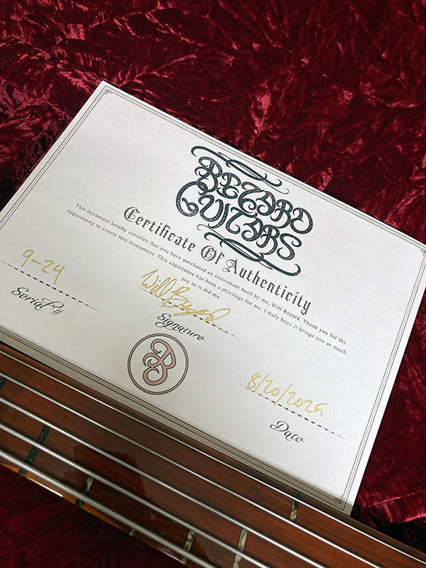 Bezard Guitars worked for the legendary Rick Turner and is now the head luthier at the Galloup School of Lutherie. Perfection is an understatement with Bezard’s meticulous attention to detail. Driven by a lifelong passion for the guitar and an unwavering commitment to craftsmanship, Bezard Guitars are an instrument first, art second. Designed to be cherished for a lifetime, from technical precision to effortless playability, each guitar is built with the highest-quality materials and a meticulous approach, ensuring each one embodies the artistry and excellence you deserve. Bezard Guitars fit, finish and quality are among the highest standards we’ve had to pleasure to offer. Check out this beautiful Famine 5 string fretless.