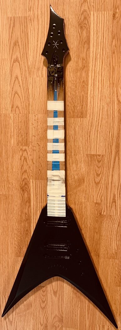 KxK crafts guitars that play like butter and look like art. A 7 string Flying V in a murdered out look.