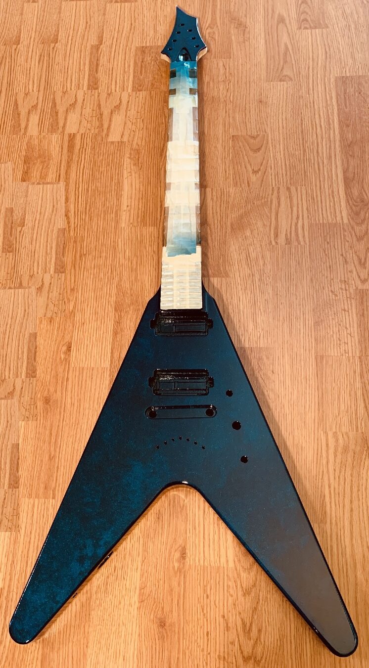 KxK crafts guitars that play like butter and look like art. A 7 string 7V3 with rounded body wings in a blue cobalt metallic finish.