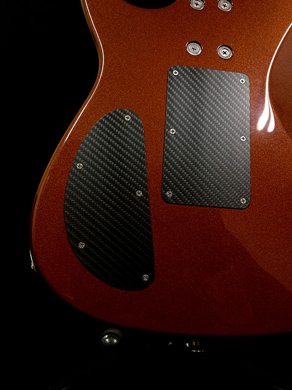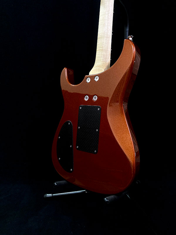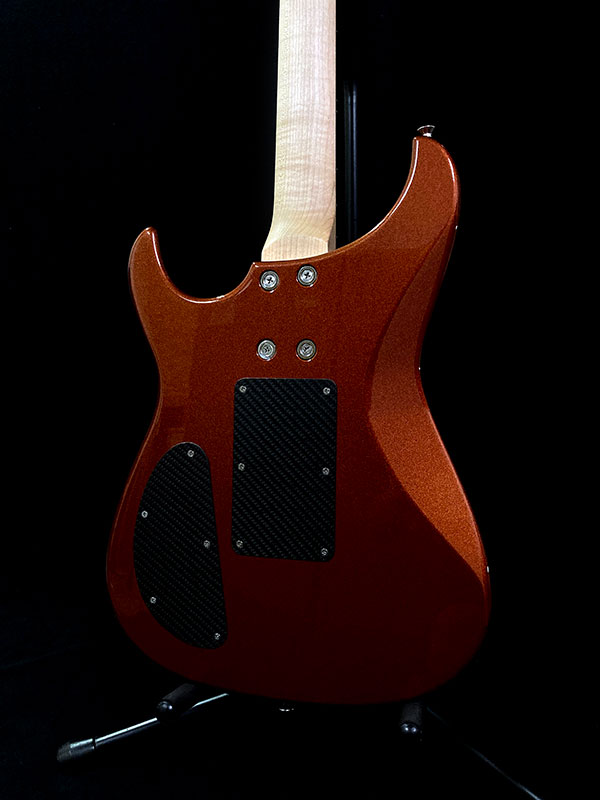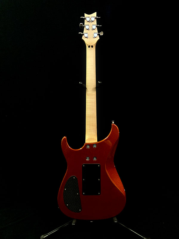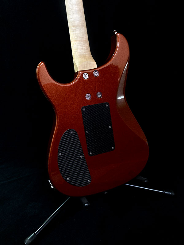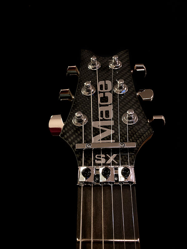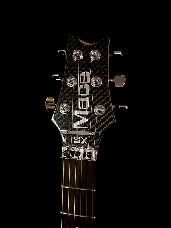Mace Guitars are built in the USA by one builder from start to finish. The SX model is a compact strat like guitar with modern appointments. Where the beauty comes from with Mace Guitars is in the construction of the neck and deep set neck pockets. This one has a quarter sawn Maple neck with an ebony fretboard and features a Ten-degree headstock angle. Mace’s focused tension-field geometry design is an advanced carbon fiber composite structure that extends from the tip of the headstock, inside the neck, to the distal end of the fretboard and is integrated into the neck mounting modules. This greatly improves the stability of the neck in all aspects. The neck shape is a very comfortable custom “C” profile and features 1-degree neck tilt angle for comfort and precision alignment with the bridge.